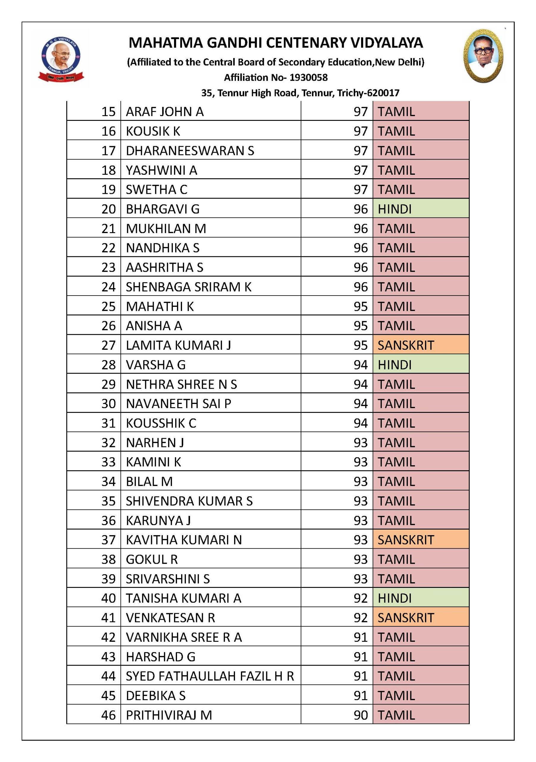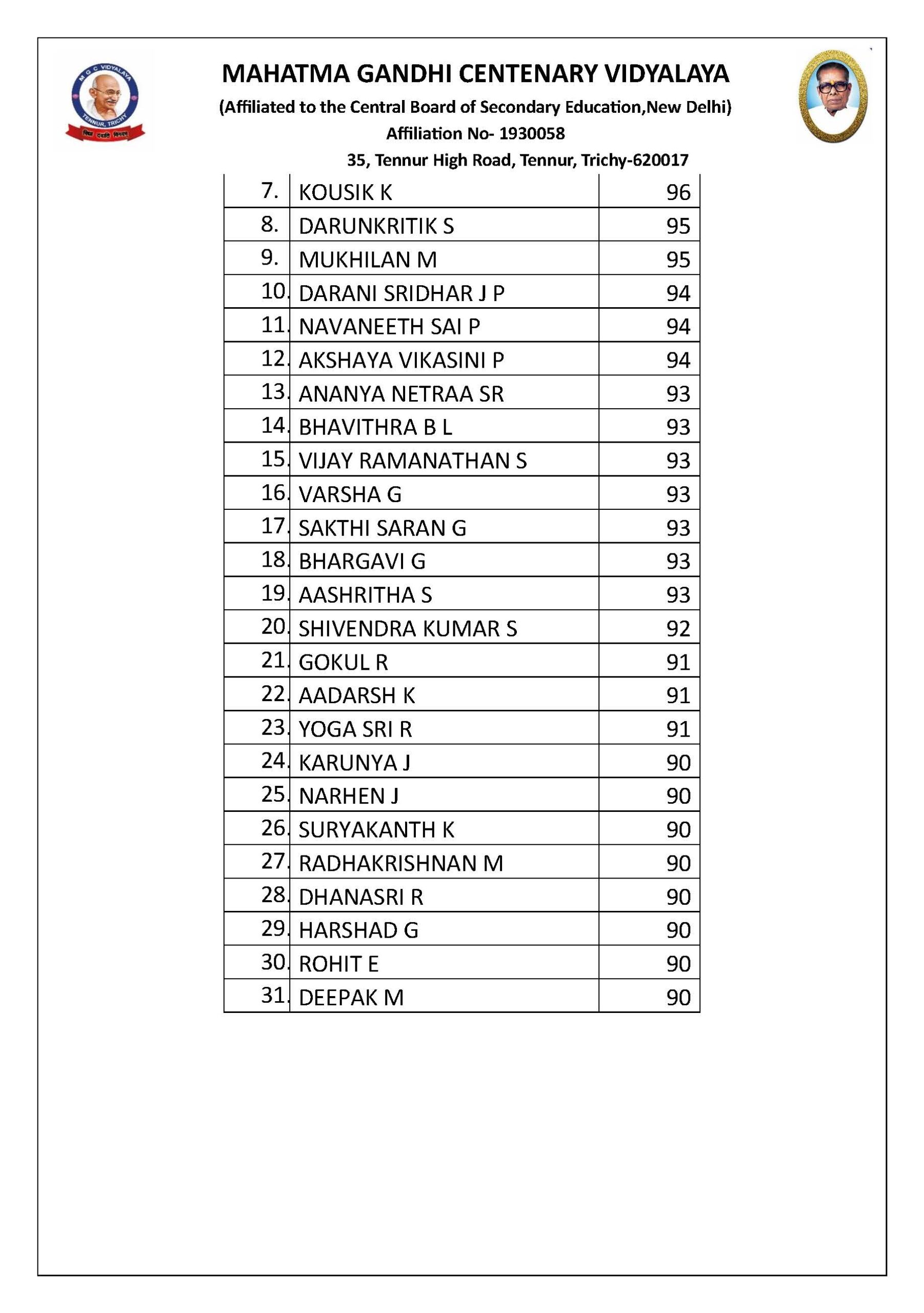 | 7 | RAKSHANAVARTHINI | 96 | TAM |