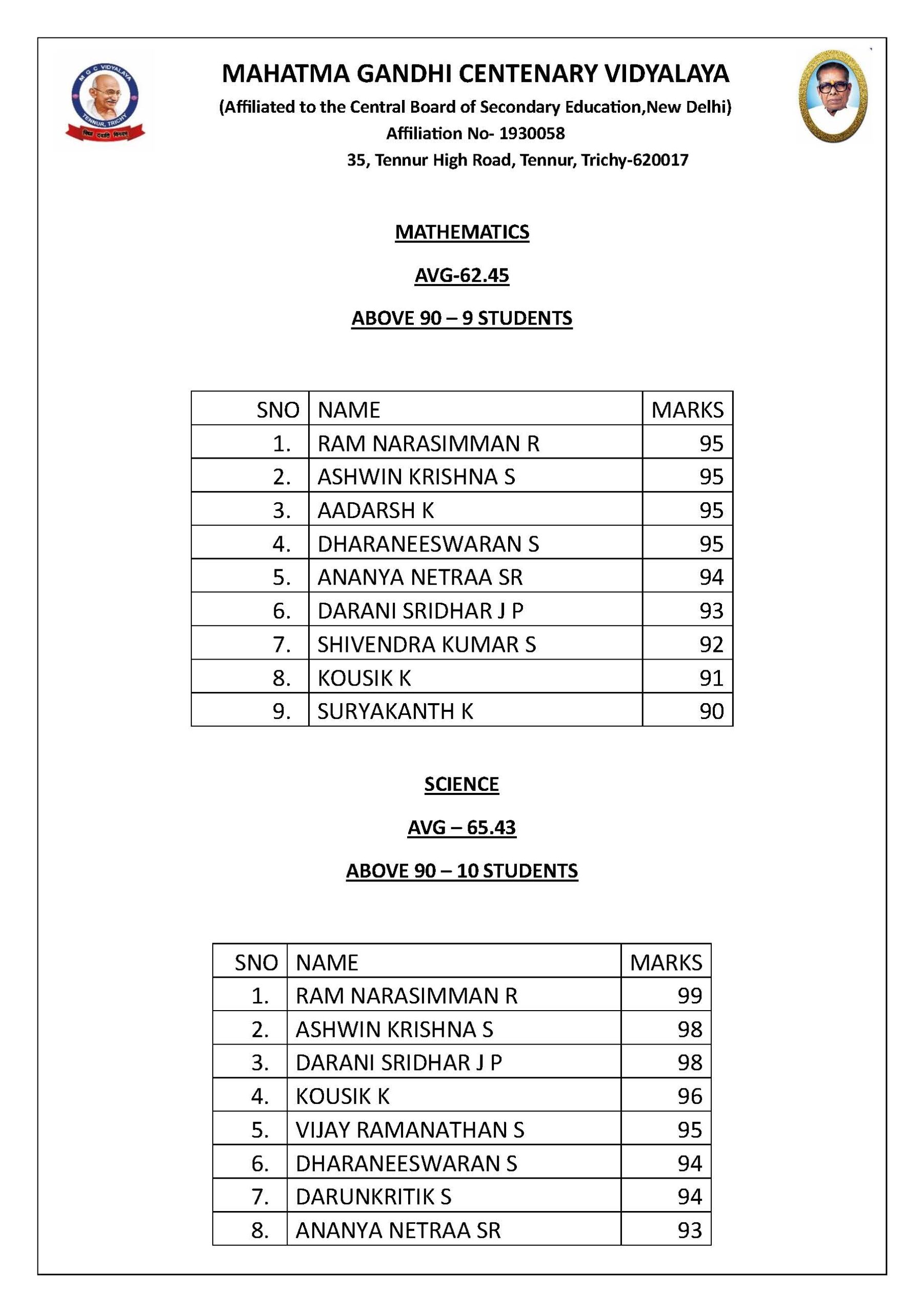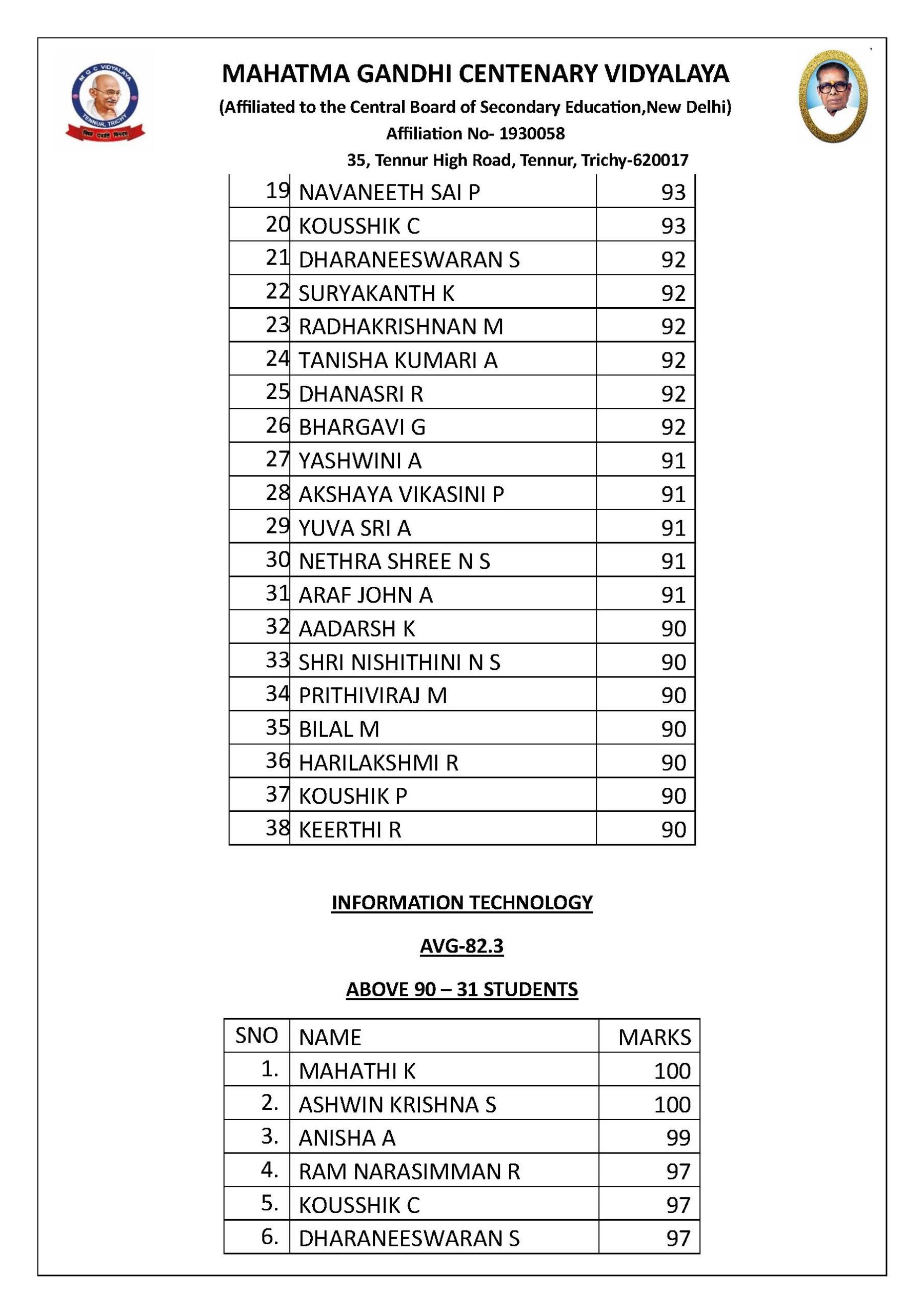 | 10 | SRINIDHI S | 92 |